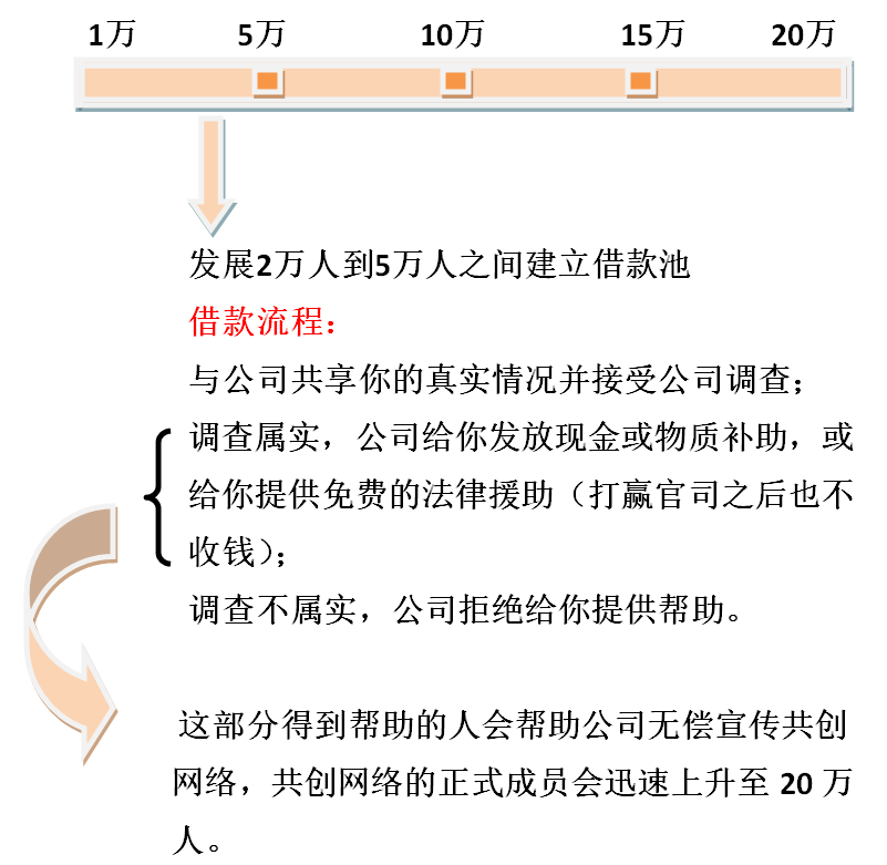 我也想尽早成立借款池,但是现实条件不允许,因为就连借款池的运营管理也需要钱,这部分钱与借款池的资金总量相比肯定是小钱,但是最起码必须要有,所以我估计在共创网络发展2万~5万成员时成立借款池比较合适。那么前期呢?怎么上升至5万人?甚至怎么上升至2万人?需要有能人异士给予指导,或者直接帮忙拉人。